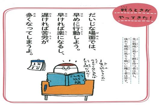 さて、10月に入りましたので、『今月の一言』を紹介したいと思います。7月からこの『今月の一言』を斎藤隆先生監修の『こども孫子の兵法』から選んでいます。体だけでなく心も大きく成長する小・中学生時代。困難にぶつかったり悩んだりすることも多くあるこの時期に、皆さんの“力”になる言葉に出会う一歩になれば・・・と(*^_^*)。