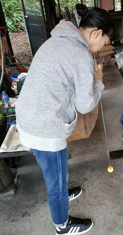 息子だけが体験するはずが、「吹きガラス」で使用する道具(名前はわからないのですが)が、約1メートルほどある筒で、かなり肺活量が必要なため、息子ではうまく膨らまず、ピンチヒッターうたこの登場!実は私も一度やってみたかったんですよね〜。