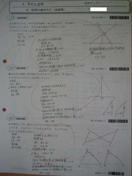 現在中学2年生は『証明』をやっているのですが、これこそ、覚える・真似する・繰り返すことができなければ身に付きません。