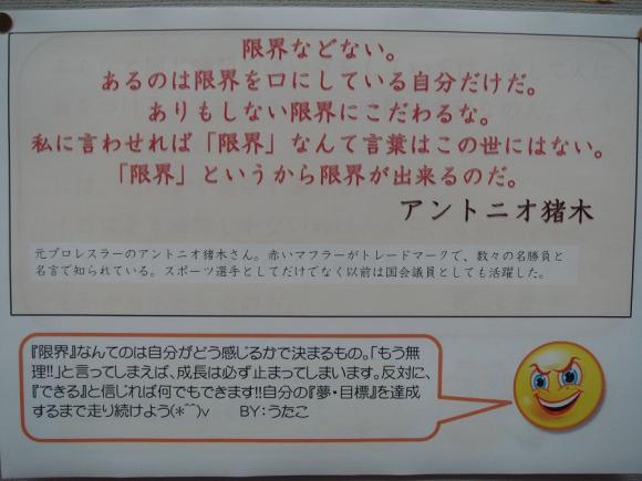 アントニオ猪木さんの言葉です。イマドキの小中学生は『無理〜』と簡単に言いすぎです!!勉強に“無理”なんてありません!!“無理”と言った瞬間から成長は止まります。無理・限界を決めているのは誰でもない、自分自身の心です。“無理”と言って投げ出してしまって良いんですか??そんな言葉で投げ出すことが出来るのであれば、はじめからやらなければいい、と思います。