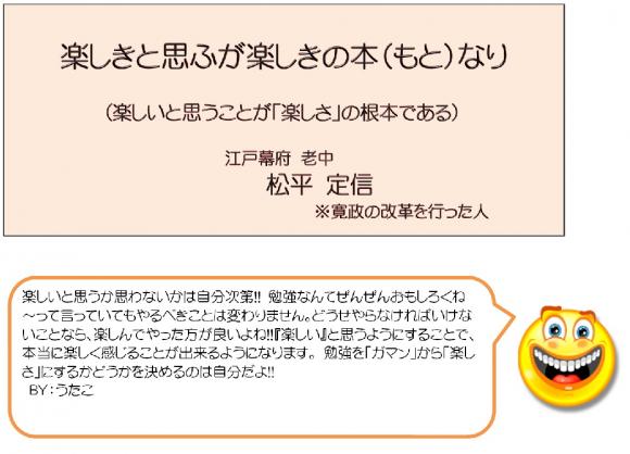 私は子どもたちに、「どうせやらなければいけないのが勉強なんだから出来るだけ楽しんだ方が良いよね」とよく言います。仕事でも勉強でもイヤダイヤダと思いながらやっていたら辛い時間を過ごすだけです。始めは難しいかもしれませんが、「楽しい」と思う努力をしていれば本当に楽しくなる時が来ると思います。学生ならば勉強で、社会人ならば仕事で一日の大半を過ごすのです。その時間を楽しい時間として過ごせたら素敵ですよね。嫌な教科や嫌な事を嫌のまま過ごしていくのか「楽しさ」に変えることができるかは自分の思い方次第です。自分の好きなことと同じくらい「楽しい」とは思えなくても「ちょっと楽しいかも・・・」と思えるようになるだけでも違うのではないでしょうか。