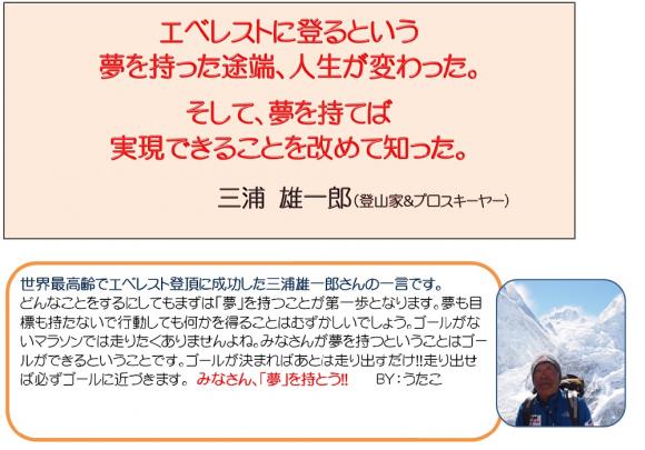 夢や目標を持たなければ人は変わることが出来ないと思います。何かをやろう、やり遂げようと思うには「夢」が必要です。目標無くして走ることは出来ません。走らなければ変わることはありません。毎日は成長するためにあります。成長のない人生なんて面白くないと思います。イマドキの小中学生は「普通」で良いとよく言いますが、「普通」に生きていくためには日々成長が必要だと思います。体が大きく成長していくのに心だけ幼い子のままでは変ですよね。心を成長させていくことはとても大切です。だからこそ「夢」が必要なんです。人は心が変わることで行動が変わり、行動が変わることで結果が変わってきます。自分が望む結果を得るためにまずは行動を変えましょう。行動を変えるためには、まず「夢」をもちましょう。そうして成長し続けることが「普通」なのではないでしょうか?