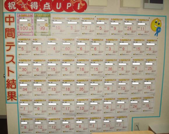 次の定期テストは9月です。あと約2ヶ月。夏期講習ではしっかりテスト対策をし、中3生は更に入試対策を並行して行い学力UPの夏となるようにしたいと思います。また、公立中学の中1生は初めてのテストでしたので、100点・99点の生徒さんのみの掲示ですが、次回からは中2・3生と同じように「得点UP」の掲示板に参戦できるよう頑張っていきましょね!!