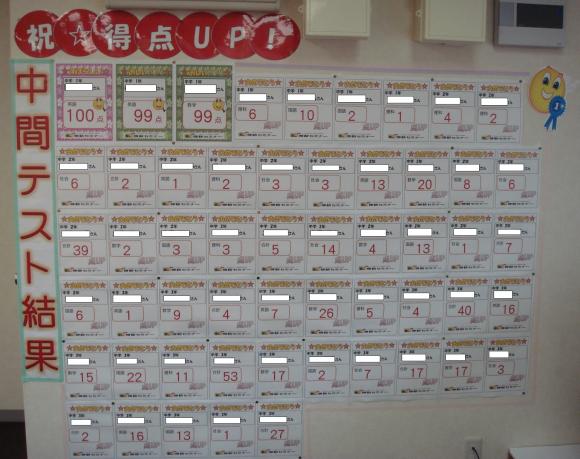 今回は全体的に平均点が下がっている教科が多いため得点UPの幅がいつもより少ないのですが、100点、99点と高得点を取る生徒、5教科合計で40・50点とぐっと得点を伸ばしている生徒もいます。こうした仲間の頑張りを是非次のテスト、入試に向かう「やる気」につなげてもらいたいと思います。