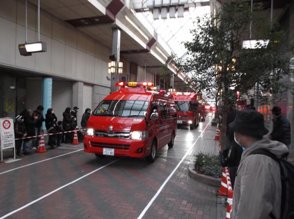 『出初式』というと、はしごの上で技を披露するものと思っていたのですが、実際には、消防隊員と消防車による行進でした。