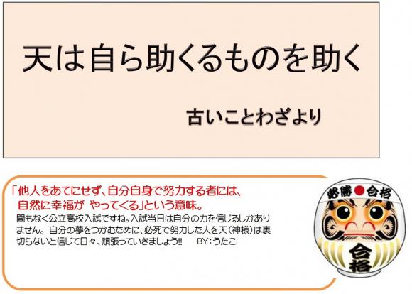 今日は、3月に月が変わりましたので、恒例の『今月の一言』です!!今月は卒業する中3生への「贈る言葉」として選んだ言葉ですが、中2・1生、小学生の皆さんにも当てはまる言葉だと思います。
