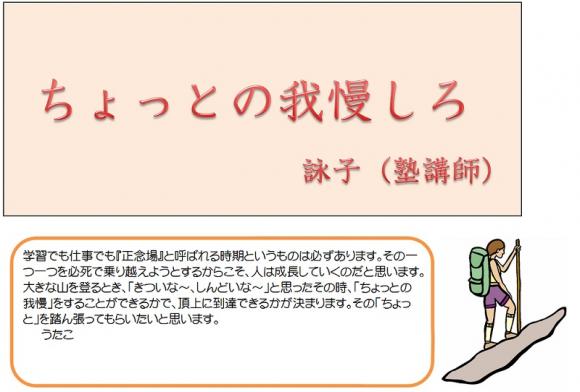皆さんを見ていると、そうそういつもいつも「我慢の連続」をしているばかりではないと思います。テスト前の今ぐらい、『ちょっとの我慢』ぐらいはしても良いのでありませんか?そして、これはテスト前の中学生さんだけではありません。小学生の皆さんも同じです。時には我慢することも経験すべきだと思います。