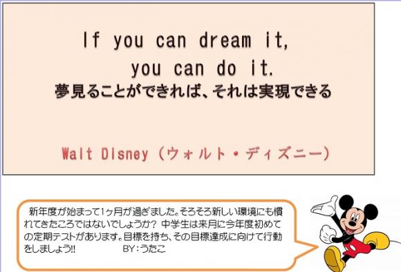 連休中ディズニーに行かれた方もいらっしゃるかもしれませんね。夢の世界を作られたウォルト・ディズニーさんの一言です。新学期が始まり1ヶ月が過ぎました。どの生徒さんも目標を持ち日々成長していってもらいたいこの言葉を選びました。
